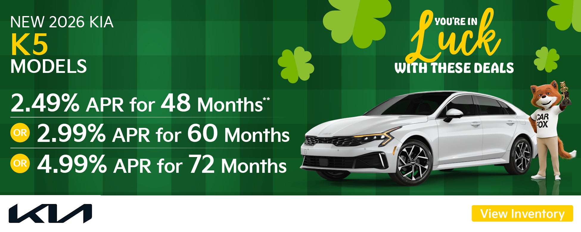 **2.49% APR for up to 48 months. $21.91 per month per $1,000 financed at 48 months. 1.49% APR for up to 60 months. $17.31 per $1,000 financed at 60 months. 4.99% APR for up to 72 months. $16.10 per month per $1,000 financed at 72 months. Subject to credit approval by Kia Finance America (KFA) for well-qualified buyers. Not available on balloon financing. Limited availability: dealer participation may affect final price. Offer valid on new 2026 K5 models. See dealer for details. Offer ends 3/31/26.